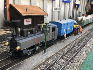 Thema: „Murtalbahn“ Rundkurs ca. 40m lang, mit dem Bahnhof Mauterndorf, der Betriebsausweiche Fliedibusch, Grenzbahnhof und der Ladestelle Hochbeet/Paprikagleis.